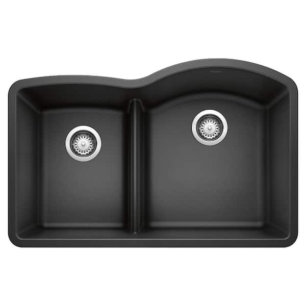 Diamond Undermount Silgranit Granite Double Offset Bowl Kitchen Sink, Coal Black